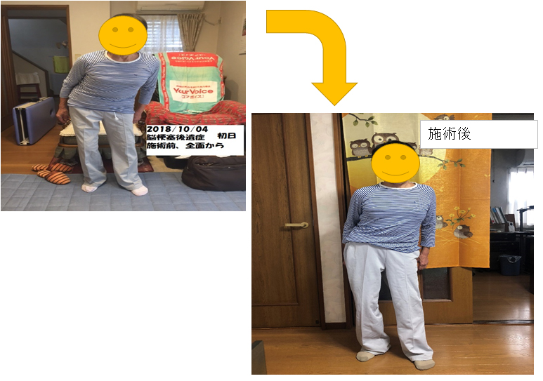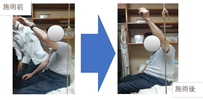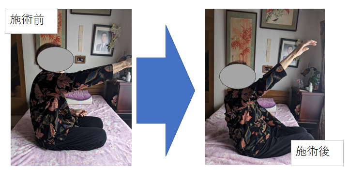 本人は、施術前と後の写真をみて、右腕が上がることに気づく。