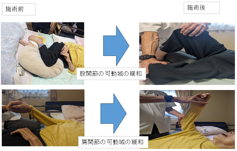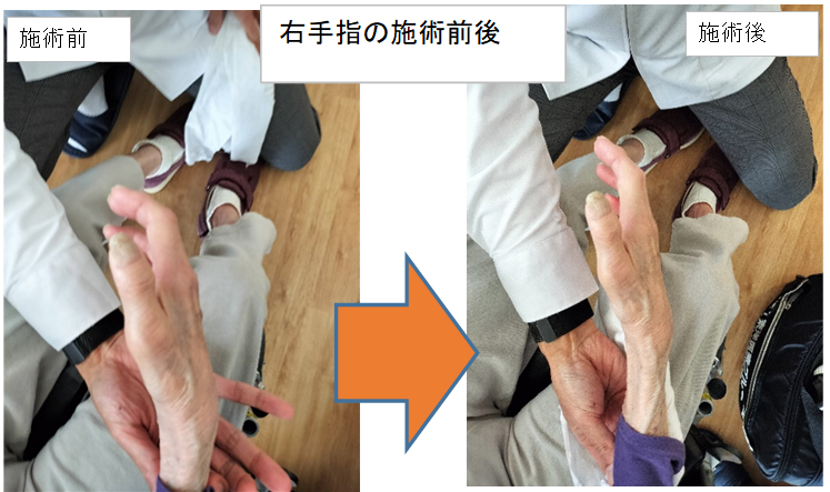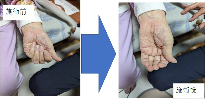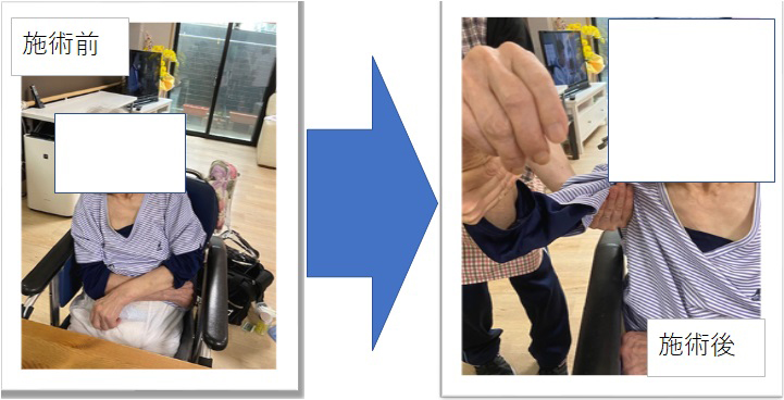 左手首と手指の関節に拘縮が見受けられたが施術後は拘縮が緩和された。