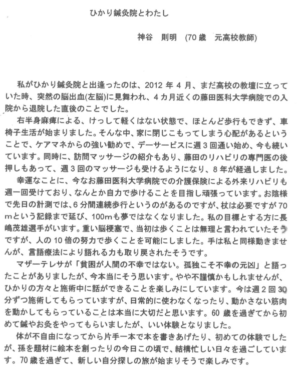 以前、当院のお試し施術に同席したケアマネージャーが施術者の細かい関節の検査法に、感絡を受けて当院に依頼。