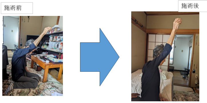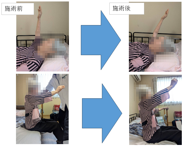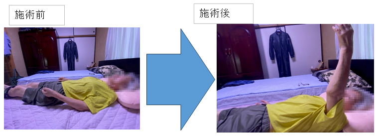 認知症(意思疎通不可)にて廃用が進行して右肩関節拘縮。服の着替えが困難。施術後は肩の関節の動きが可能となり挙上可能となる。