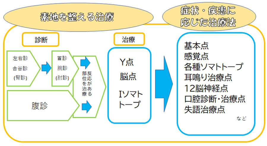 - 神経、内分泌系処置:人は自律神経および内分泌機能によって身体の全身調整が図られバランスがとられています。バランスが乱れると、病気に傾いていきます。これらを調整する処置です。