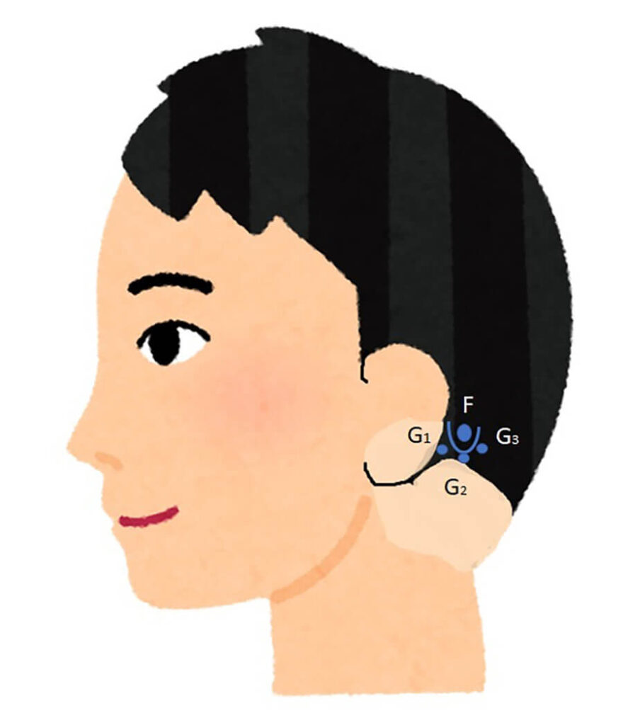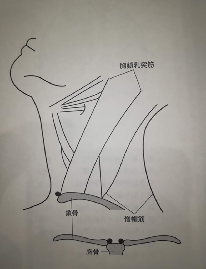 - 局所診(口蓋扁桃や頸部リンパ節に関係が深いのが天ゆうというツボ。その他、肩井や陰陵泉、胸鎖乳突筋の辺り)