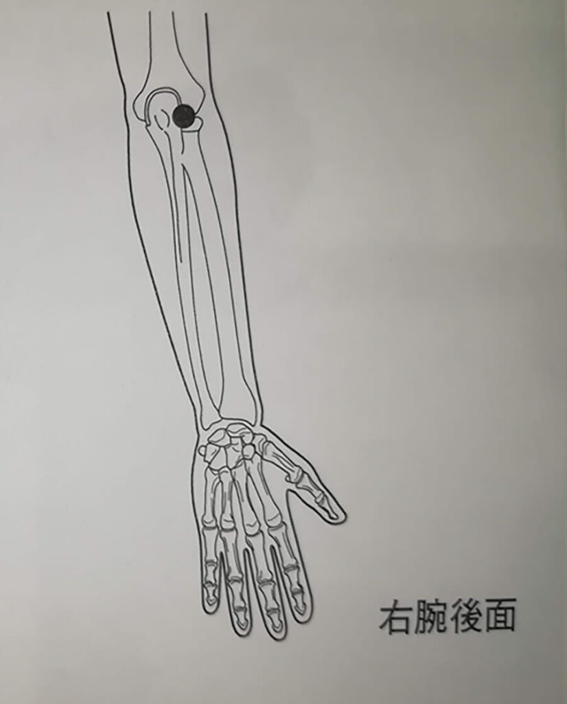 この炎症起こしているツボを火と捉えて、ライン上にある水穴と言う水のツボに針を刺して火(炎症)を沈めるというものです。